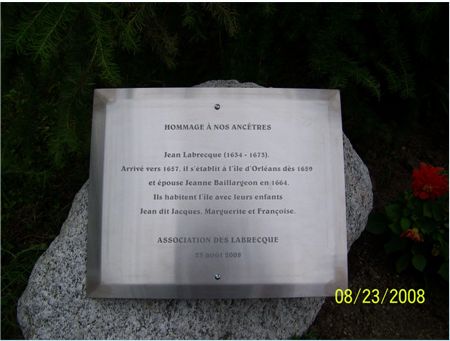 On August 23, 2008, commemorative plaques were unveiled to mark the 350th anniversary of the The arrival of the first Labrecque in Nouvelle-France.